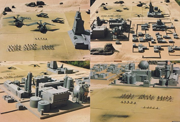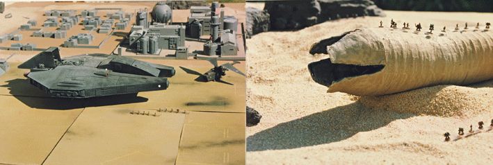 La surface du spatioport est un carton peint à l’aérographe. Le plateau de jeu est un tissu, recouvert de sable à certains endroits. Les rochers sont en polystyrène, enduits de plâtre et peints. Etant fragile, le plâtre a été abandonné pour les décors futurs, le polystyrène étant simplement peint par brossages successifs (en général 4, du plus foncé au plus clair).