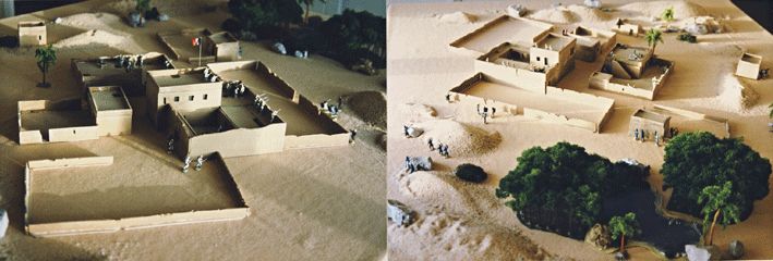 Les dunes, en vrai sable du désert, permettent d’y « planter » les figurines pour qu’elles toujours en position debout, malgré la pente. Les bâtiments et les murs sont en carton plume, découpé au cutter et peint. Les fonds des bâtiments et les toits plats ont été enduits de colle et de sciure avant d’être peints. Tous les toits s’enlèvent pour permettre de jouer à l’intérieur. Les portes, elles-aussi, sont amovibles. Les figurines sont des troupes de la Légion étrangère et des musulmans (figurines Airfix 1/72). Canon et mitrailleuse appuient la défense française, souvent submergée par des Touaregs impulsifs mais assez mal équipés avec leur vieux mousquets, leur boucliers et leur épées.