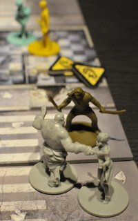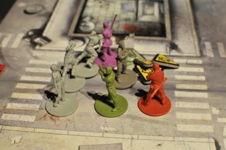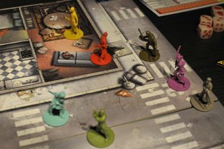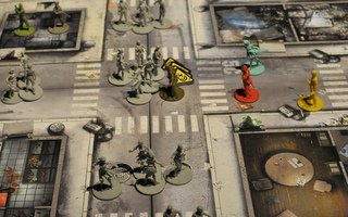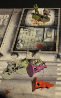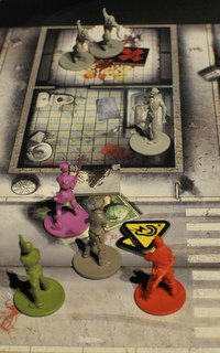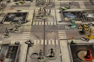 Le jeu commence de manière très calme puisqu'aucun zombie n’est présent sur la carte en début de partie (en tout cas pour la mission que nous avons choisie); c’est en fouillant les bâtiments et à la fin de chaque tour que les zombies apparaissent. Le nombre et la force des zombies sont directement fonction du plus haut niveau parmi les survivants. Donc en gros, plus vous tuez de zombies, plus vous êtes puissant et plus vous êtes puissant, plus les zombies sont nombreux et forts...