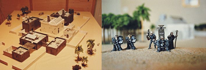 La photo de gauche montre les décors, celle de droite, l’Empereur accompagné d’une Bene Gesserit, de son mentat et de deux gardes Sardaukar.