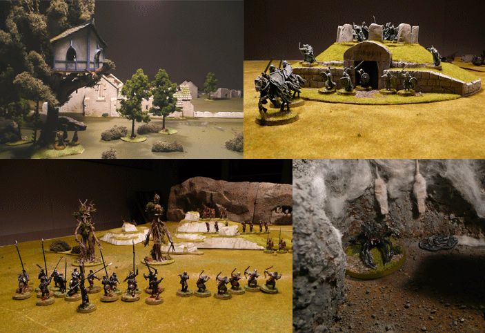 En bas à gauche : Uruk Hai et Orientaux attaquant des Ents faits maison avec des racines naturelles collées à la colle chaude.