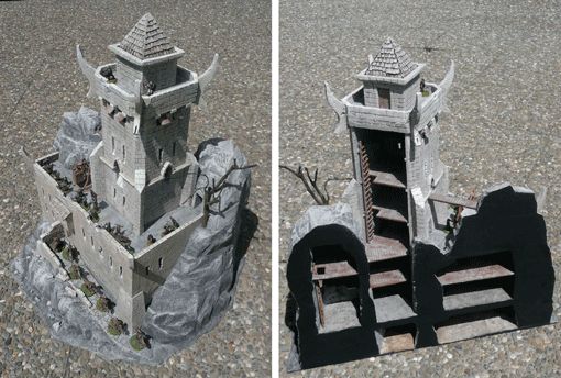 La forteresse de Cirith Ungol, là où Frodon a été enfermé après son passage dans l’antre de Shelob. Entièrement en polystyrène, construit en 40 heures selon mon imagination, juste sur la base d’un croquis. La forteresse est encastrée dans une falaise, de façon à pouvoir la placer en bordure de terrain et de jouer à l’intérieur. Les planchers sont en carton et les échelles sont en bois. La forteresse a été conçue pour offrir un maximum de possibilités pour déplacer des soldats dans tous les sens et donc de pouvoir reconquérir une zone prise par l’ennemi. La terrasse principale peut accueillir un trébuchet et un chaudron rempli d’huile bouillante, tous les deux fait maison avec du bois.
