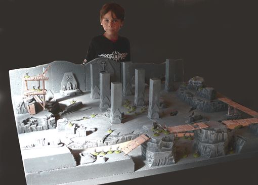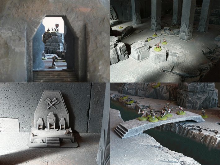 Les colonnes sont en bois (assez lourd pour ne pas tomber quand on déplace les figurines), et les moulures en base de colonne réalisée en carton épais. Les rochers sont aussi en polystyrène extrudé, d’abord grossièrement taillés au cutter, puis modelé avec les doigts pour arrondir un peu les angles et gravés avec les ongles pour imiter les strates et les fissures de la roche. Enfin, ils sont peints comme le plateau. La forme des rochers est étudiée pour qu’ils puissent se juxtaposer pour créer des plateformes plus grandes, ou se superposer pour créer des colonnes naturelles.