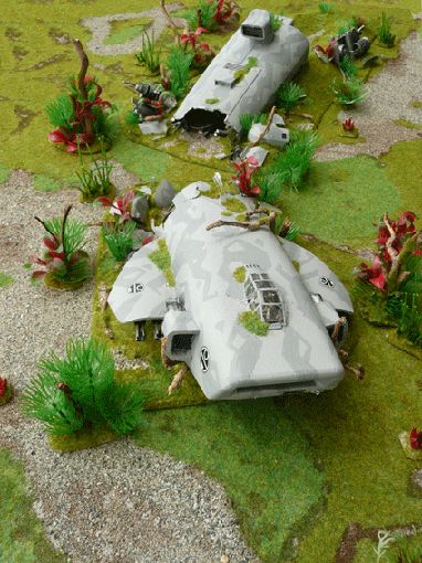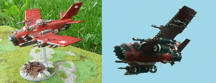 Bombardier ork, type « bomba », avec son socle en forme de cratère dû à l’explosion d’une bombe. Vue depuis dessous pour bien voir l’armement de ce redoutable aéronef.