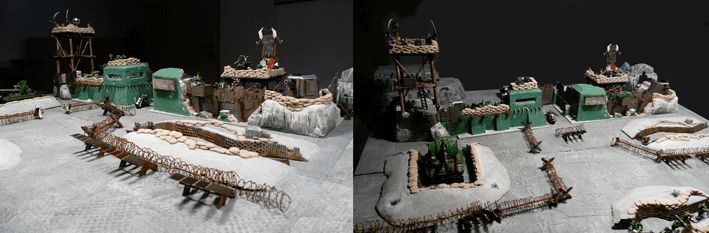Les tranchées sont en polystyrène, avec la tranche agrémentée de morceaux de carton ondulé et de plaque perforée en aluminium. Une fois collé, tout est peint en argenté puis avec des touches de brun pour la rouille. Les sacs de sable sont en pâte à modeler, collés un à un à la colle chaude pendant qu’ils sont encore mous. Les superstructures sont en bois, collé aussi à la colle chaude. De la ficelle est utilisée pour simuler les attaches en corde. La tourelle avec le canon est faite à partir d’une boîte de fromage St-Agur ! L’ensemble de ces décors a demandé plus de 70h de travail.
