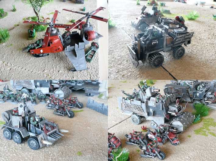 Le kopter à deux rotors est en carton. Le train d’atterrissage et les réacteurs proviennent d’une « moto futuriste ». L’armement est de l’équipement ork standard en rab sur les grappes. Le châssis de la moto a été réutilisé pour créer un side-car équipé d’un Karbonisator (photo en bas à droite). Armée peinte entre 2010 et 2012.