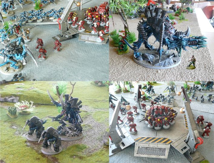 Les Tyranides sont une armée incontournable de W40K. Je les ai peints dans une gamme de couleur un peu inhabituelle. Le bleu ressort bien sur tous les terrains, quand on aligne 140 Tyranides, on a l’impression d’une marée que rien ne peut arrêter. N’ayant pas trop le temps de soigner les détails, je me contente d’une sous-couche noire, puis 2 à 3 brossages avec du bleu de plus en plus clair. Ce qui est important pour moi est l’effet de masse. Les créatures monstrueuses sont un peu plus soignées, surtout les socles où je m’amuse à y entasser des cadavres d’Orks à moitié déchiquetés. Un Catachan (humain) a été mis sur la photo en haut à droite pour bien montrer la taille d’un Tyranofex. En bas à gauche, le Maître des Essaims avec sa garde.