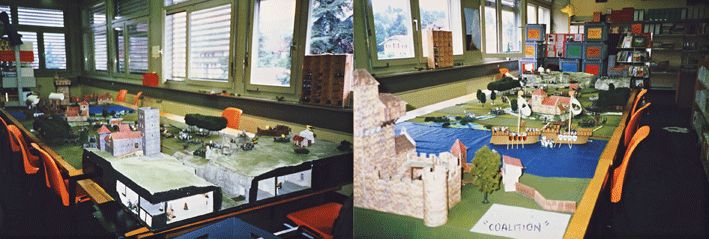 Le château est en bois (Pavatex), recouvert d’un bristol imprimé (imitation de mur en pierre acheté dans le commerce). C’est du solide, mais tellement long à réaliser que j’ai ensuite opté pour le carton plume et les plaques de polystyrène, beaucoup plus facile à découper, à coller et surtout à transporter. Tout est démontable et permet différentes combinaisons selon le scénario.
