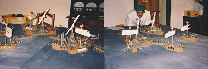 Bataille navale avec 800 figurines de 25mm embarquées sur deux caravelles, quatre nefs et 4 barques à rames. J’avais construit suffisamment de navires pour embarquer toutes mes figurines, sauf les cavaliers, bien sûr. Les règles de jeu ont été crées pour l’occasion.